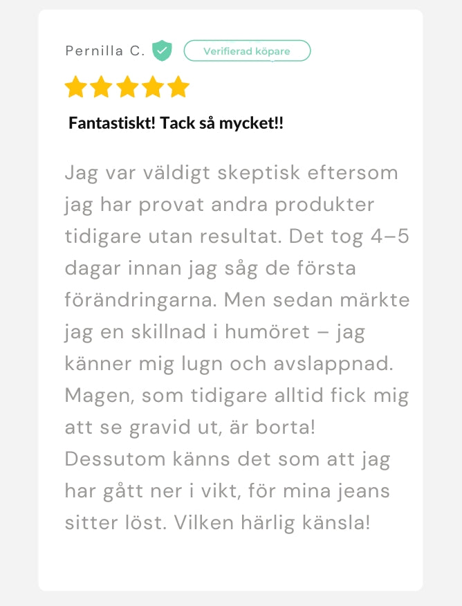 Jag har precis tagit min första burk men har redan märkt en stor skillnad i humör och energi – och jag har gått ner 2 kg!! Ser verkligen fram emot att fortsätta med dessa magiska örter!